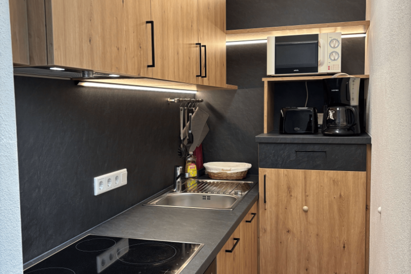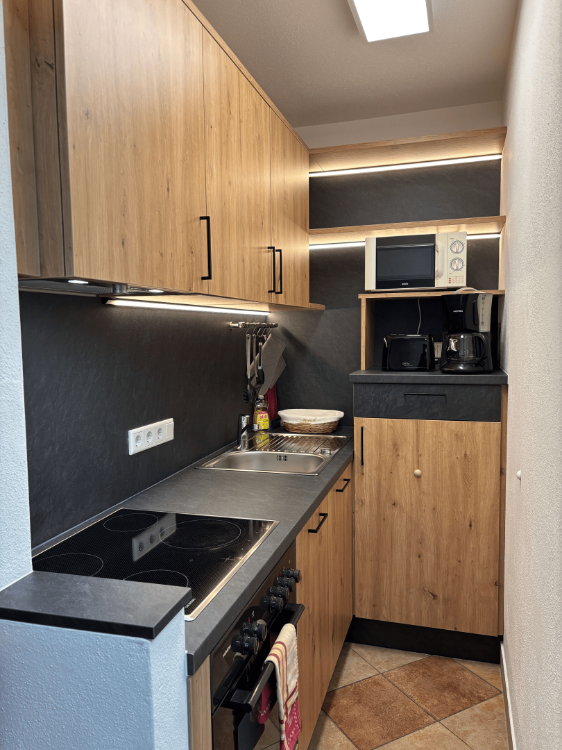 - Küchenzeile, komplett ausgestattet mit 4-Platten Cerankochfeld inkl. Backofen, Mikrowelle, Kühlschrank mit Gefrierfach, Wasserkocher und Kaffeemaschine